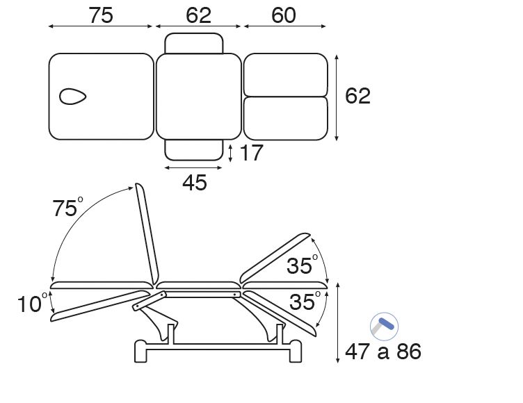 La camilla Hidráulica C3739R se regula en altura mediante pedal hidráulico. Dispone de ruedas escamoteables, mediante pedal único. Parte superior elevable 80º y abatible 15º , parte inferior elevable 35º y abatible 35º.