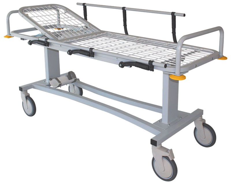 La camilla rodante tiene un reposacabezas ajustable y barandillas laterales plegables para mayor seguridad en los desplazamientos. También incorpora un práctico soporte para bombonas de oxígeno que facilita el acceso al tratamiento durante el transporte. Gracias a su camilla extraíble, puede utilizarse de diversas formas, en función de las necesidades del departamento.