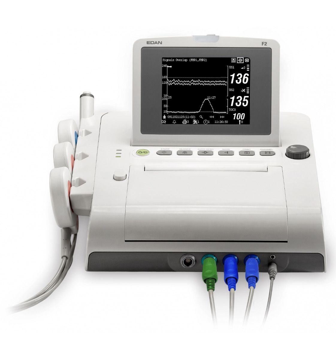 Este cardiotocógrafo Edan cuenta con la tecnología SOV que verifica automáticamente las señales cruzadas en embarazos gemelares, así como un indicador de calidad de la señal que optimiza la posición del sensor. Además, el Edan F2 tiene una memoria de 60 horas, una batería autónoma que dura 7 horas, alertas sonoras y visuales, y marcadores de eventos.