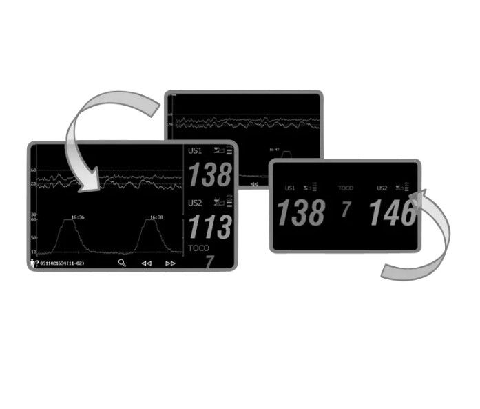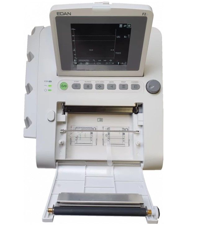 Descubre el cardiotocógrafo EDAN F2, un monitor fetal con una pantalla de 5.6 pulgadas en blanco y negro con 3 modos de visualización diferentes (trazados + valores, solo trazados o solo valores).