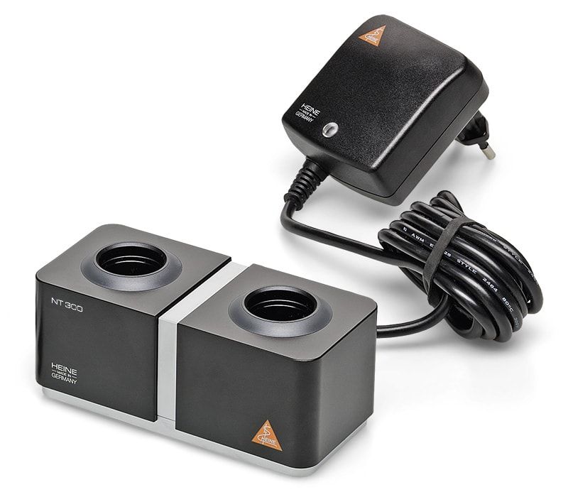 El Cargador NT 300 carga automáticamente baterías recargables HEINE independiente de su estado de carga o de su tensión de salida. La batería recargable no se puede sobrecargar. Con el equipo de adaptador apropiado es posible recargar todos los mangos recargables BETA L, BETA NT, BETA SLIM y los mangos recargables de laringoscopios en el mismo NT 300.