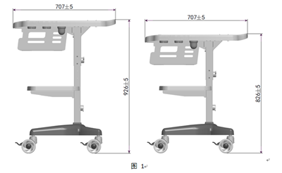 El carro para ecógrafos portátiles de ultrasonido U50 y DUS60 es ajustable en altura, con un rango de 82,6 cm a 92,6 cm. Cuenta con un soporte para la sonda y la impresora, así como con una plataforma para colocar el ecógrafo.