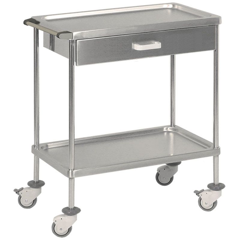 El carrito de curaciones Hidemar, esta hecho en acero inoxidable y cuenta con dos estantes y 1 cajón. El carrito dispone también, de una asa lateral para facilitar el movimiento. Sus ruedas son silenciosas ya que han sido fabricadas en caucho, dos de ellas incluyen freno y tienen un diámetro de 75mm.