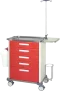 Los cinco cajones de apertura total al 110% con cierre automático son ideales para acceder rápidamente al material médico. Los tiradores de diseño ergonómico y los espacios de etiquetado permiten organizar cada cajón según las necesidades específicas de los usuarios. La encimera de acero inoxidable con bordes antigoteo proporciona una superficie de trabajo segura y fiable, y también puede pedirse en plástico ABS.