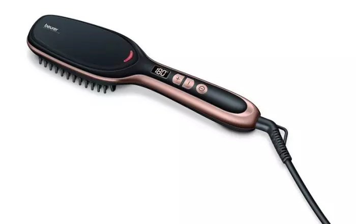 El cepillo plancha para pelo HS 60 Beurer le permite cepillar su pelo con el objetivo de desenredarlo y alisarlo al mismo tiempo. El peine le permite cuidar de su cabello con total seguridad ya que este se encuentra hecho con un revestimiento en cerámica que le garantiza la protección de su pelo. Por otro lado, el cepillo posee un sistema de apagado automático para evitar todo tipo de riesgos. Asimismo, el cepillo no solo le permitirá alisar su cabello sino también dejarlo suave y sedoso. Usted puede configurar la temperatura de su cepillo según el tipo de su cabello. En efecto, el cepillo para alisar el pelo de Beurer HS 60 se encuentra dotado de nueve niveles de temperatura diferentes que van desde 120 °C a 200 °C. La fase de calentamiento de temperatura no toma sino unos cuantos minutos con el fin de que usted pueda utilizar el cepillo de manera rápida. El peine posee una luz de indicación que le permite saber cuando el cepillo ha alcanzado la temperatura deseada para que usted lo utilice. Le recordamos que el cepillo debe ser utilizado sobre el cabello seco con el fin de evitar todo riesgo y con el fin de evitar daños en su cabellera.