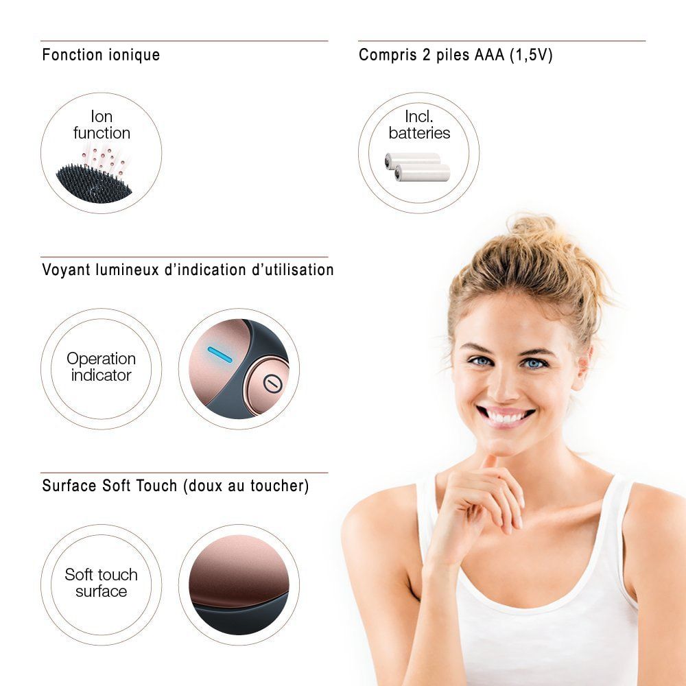 El cepillo de desenredar iónico Beurer HT 10 es un peine ideal para que usted pueda tener su cabello sedoso y brillante gracias a la tecnología iónica con la cual se encuentra dotado. Su formato en tamaño pequeño hace que sea fácil de transportar y además gracias a su superficie con sistema Soft Touch, el peine es agradable de manipular. Las cerdas del cepillo son sintéticas lo cual le permite deshacerse de los nudos de su cabello de manera suave con el objetivo de peinar su cabello sin causar ningún tipo de dolor. El peine funciona con pilas las cuales son las que permiten activar su funcionalidad iónica. Asimismo, el cepillo está equipado con una luz que le indica el momento en que el cepillo puede ser utilizado junto con la tecnología ionizante.