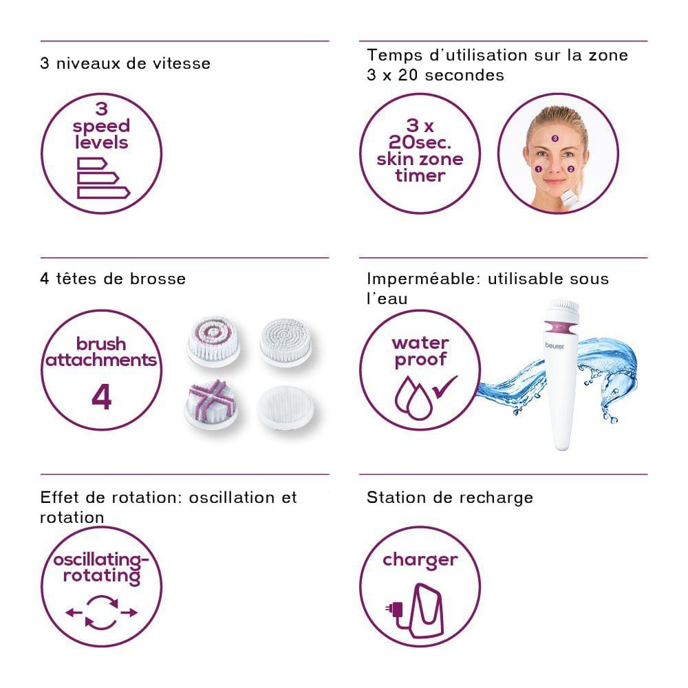 El Cepillo facial Pureo Deep Cleansing Beurer FC 95 cuenta con 4 cabezales intercambiables: uno para todo tipo de pieles, otro para pieles sensibles, otro para una exfoliación más en profundidad y el último para una limpieza más en profundidad de los poros de la piel.