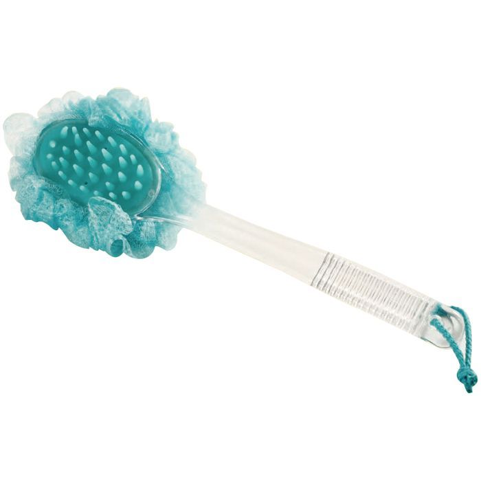 • Cepillo esponja con un manguito en plástico ligeramente curvado y antideslizante para la ducha o el baño.