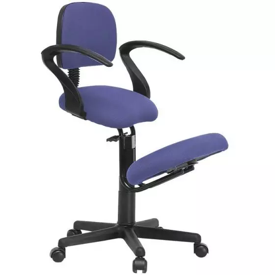 La silla ergonómica con reposabrazos Ecopostural S2703 es una silla de oficina regulable en altura de 50 a 62 cm. Versio de silla con respaldo y reposabrazos equipada con un reposa rodillas. La base y las ruedas son de color negro. El respaldo es regulable en profundidad y la anchura total de la base es de 60 cm.