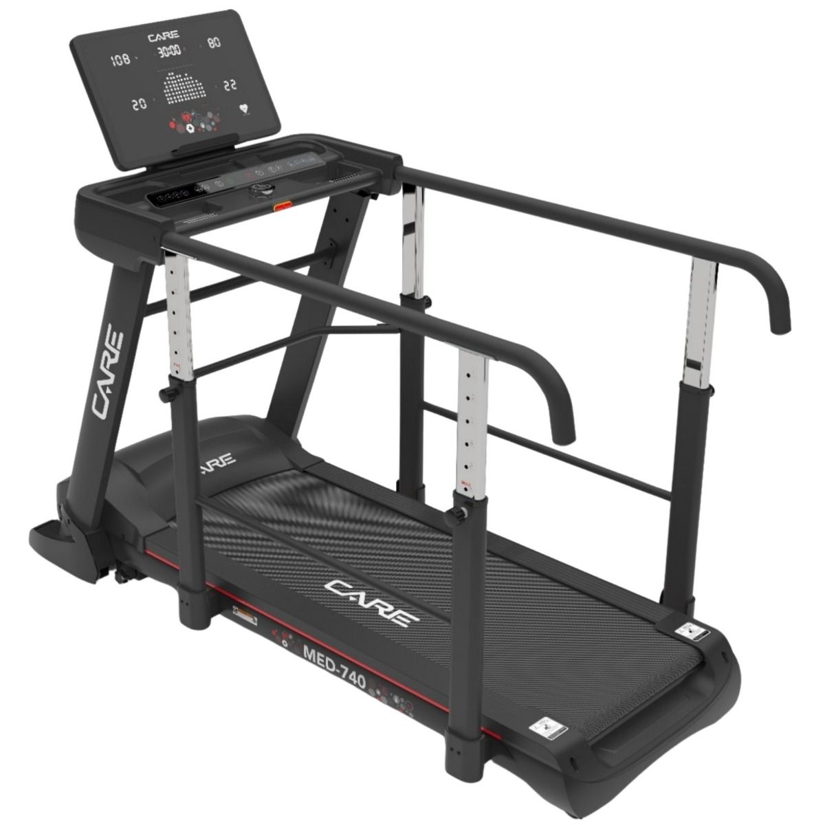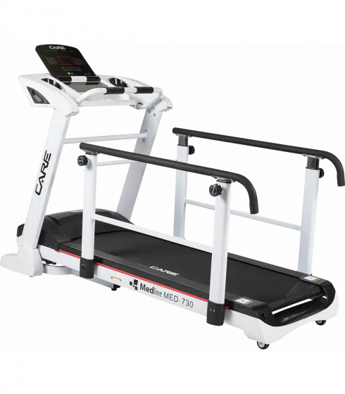Descubra la cinta de rehabilitación Med-740 de Care Fitness. Esta cinta dispone de 20 programas de entrenamiento. Dispone de 20 niveles de inclinación motorizados que se pueden ajustar durante la sesión. Sus sensores de frecuencia cardiaca miden su ritmo cardiaco.
