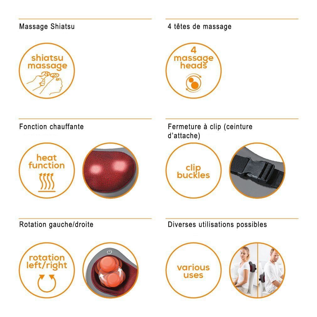 Gracias a su funcionalidad de calefacción y a sus cuatro cabeceras rotativas, el masaje que usted recibe es agradable, eficaz y rápido, todo con el objetivo de ayudarlo a mantener una salud óptima. Sus cuatros cabeceras de masaje rotativas le permiten recibir un masaje lo más efectivo posible ya que las cabeceras rotan sobre dos posiciones diferentes: de derecha a izquierda y en pares. La forma de la almohada masajeadora Beurer Shiatsi MG 149 ha sido especialmente fabricada para adaptarse perfectamente no solo al cuello y espalda de las personas sino también a los brazos y las piernas. Asimismo, ha sido concebido para adaptarse a todo tipo de cuerpos. Finalmente, es importante destacar que el aparato está dotado de una fijación la cual le permite enganchar el cojín a una silla de manera fácil y sencilla para que usted pueda recibir su masaje cómodamente.