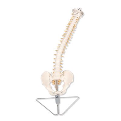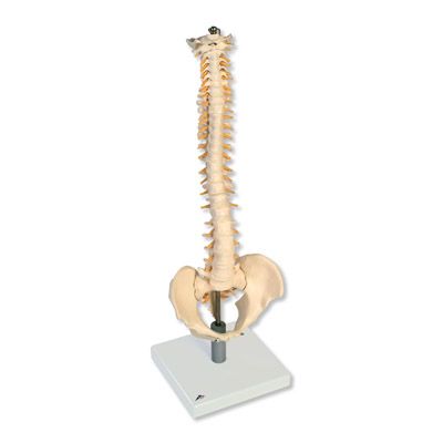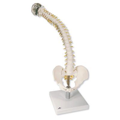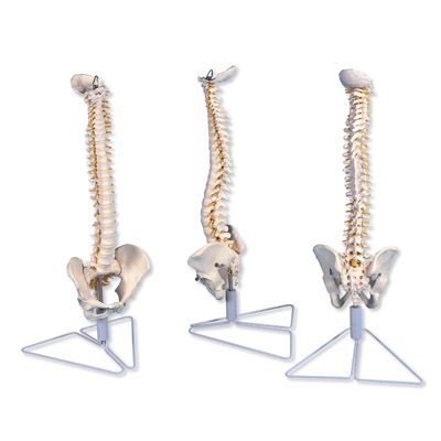 Los discos suaves brindan mayor realismo. Esta columna única muestra cómo se deforman los discos durante una posición normal y anormal. Utilícela para demostrar cualquier número de condiciones patológicas tales como escoliosis, lordosis, cifosis o subluxaciones. La formación de la hernia se puede demostrar con compresión. Además, el soporte especial permite ver el modelo de manera despejada durante la demostración y presentación. Incluye duramadre espinal y nervios vertebrales. Con soporte soporte desmontable.
