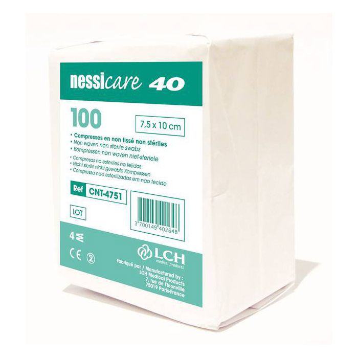Compresas no tejidas, no estériles, 40 grs Nessicare LCH - De estructura homogénea, flexible y suave - Gran poder de absorción - Paquete de 100 compresas - Peso: 200 g