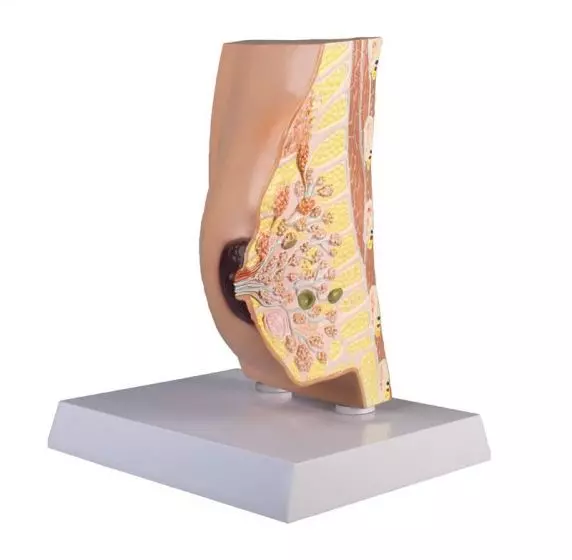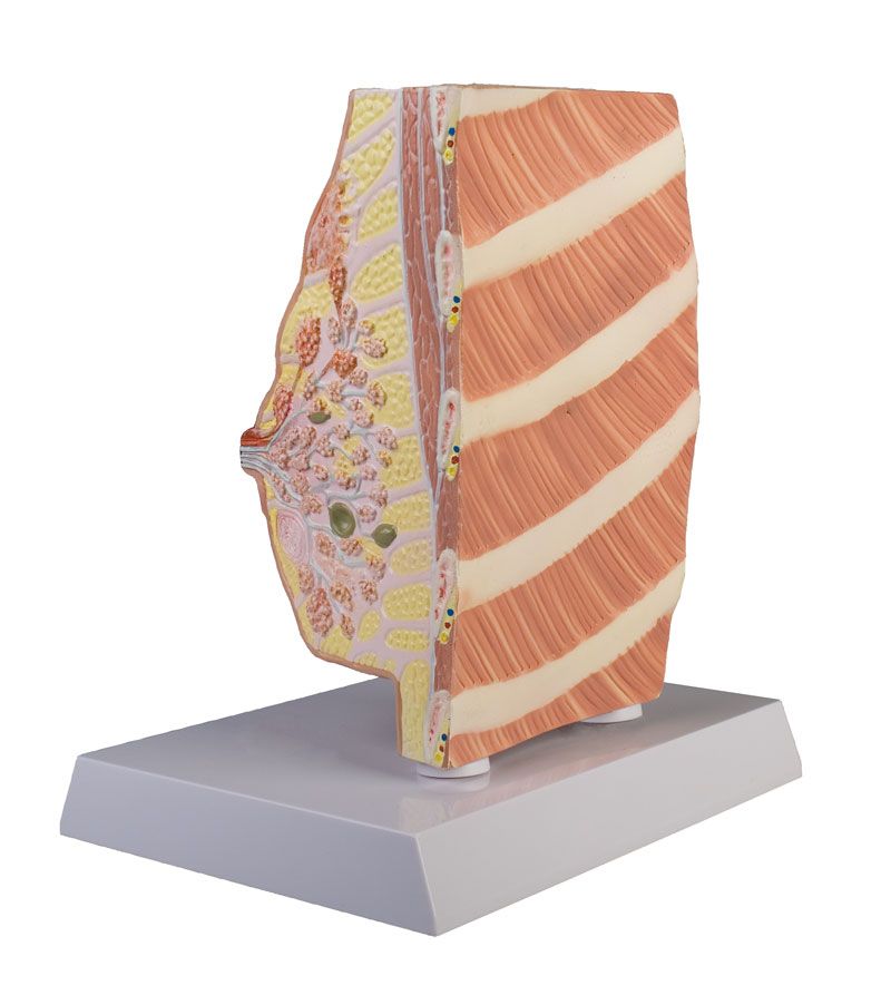 Corte transversal del pecho con enfermedades. El modelo presenta los síntomas siguientes : CIB, précancérose, CIT, IDC, la enfermedad de Paget, fibroadenoma, pseudo forfaitario, mastopatia e quistes. El modelo muestra también la anatomia normal del pecho asi como las estucturas como la capa muscular e costillas. Con la carta educativa y la clasificación del cáncer del pecho. Zócalo amovible.
