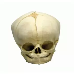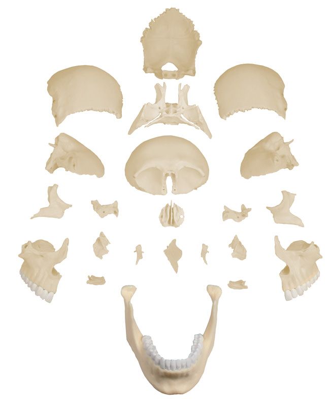 No son necesarios alfileres ni otros soportes para mantener los huesos de este cráneo articulado unidos. Las suturas craneales, representadas de manera simple, están equipadas de estrías de encaje discretas y sólidos permitiendo montar los diferentes huesos para formar el cráneo.