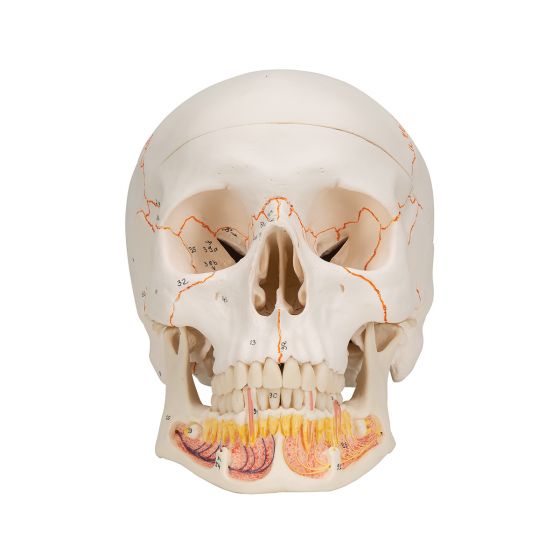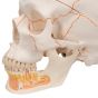 Cráneo clásico con mandíbula abierta, desmontable en 3 piezas 3B - A22. Este cráneo dental posee una mandíbula que permite visualizar las raices dentales con sus vasos y nervios.