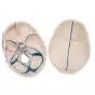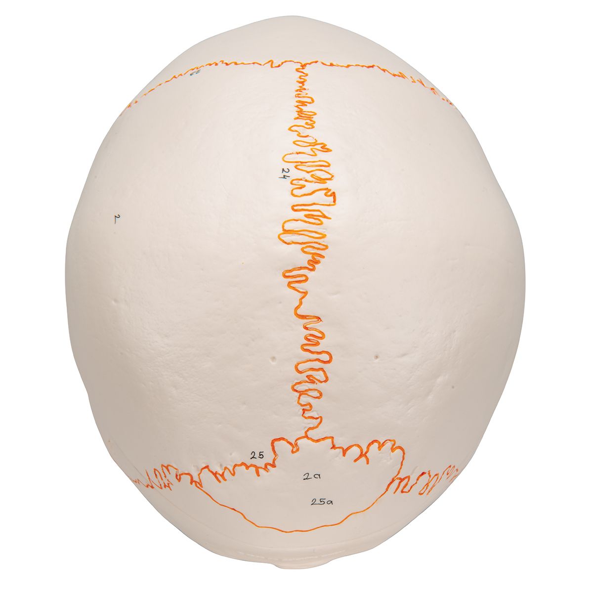 Están numerados los huesos craneales, los elementos óseos, los surcos, los agujeros y otras estructuras. Las suturas craneales están representadas con colores, así como los vasos de las meninges y los senos venosos.