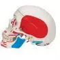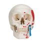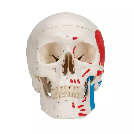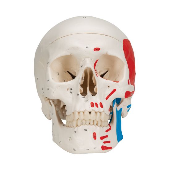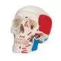 Cráneo clásico, pintado, 3 partes 3B - A23. El origen (rojo) y las inserciones (azul) musculares están pintadas en el lado izquierdo del cráneo.