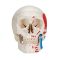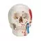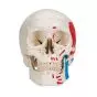 Cráneo clásico, pintado, 3 partes 3B - A23. El origen (rojo) y las inserciones (azul) musculares están pintadas en el lado izquierdo del cráneo. Con numeración de los huesos y las estructuras del cráneo en el lado derecho.