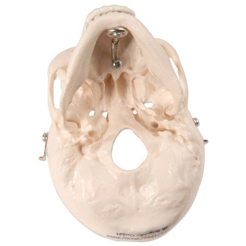 Nuestro cráneo miniatura que representa exactamente y con fidelidad de detalles las estructuras anatómicas, es desmontable en calota craneal, base craneal y mandíbula.