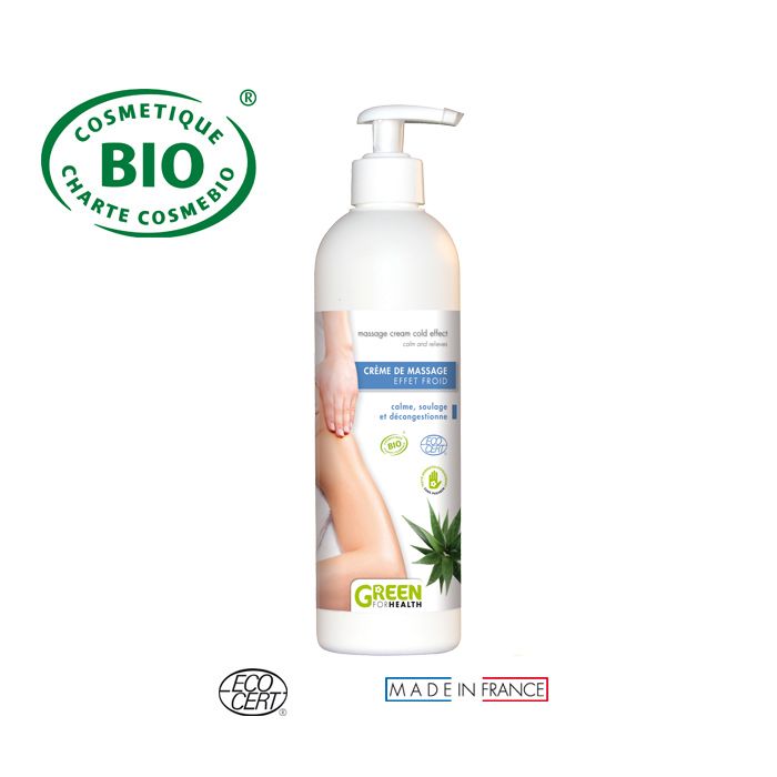 Basado en aloe vera y mentol, la crema de masaje efecto frío Bio 500 ml Green For Health está diseñado para masajes largos y cortos.
