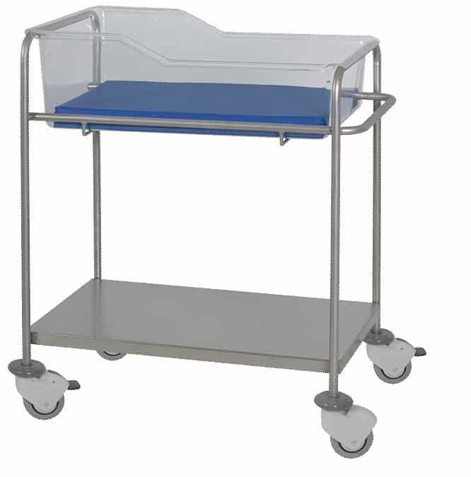 La cuna de forma anatómica en plástico termoformado transparente viene estructurada de acero inoxidable. Las dimensiones interiores son de 65x35cm. Ruedas de 100mm con parachoques, con freno y es entregada sin colchón