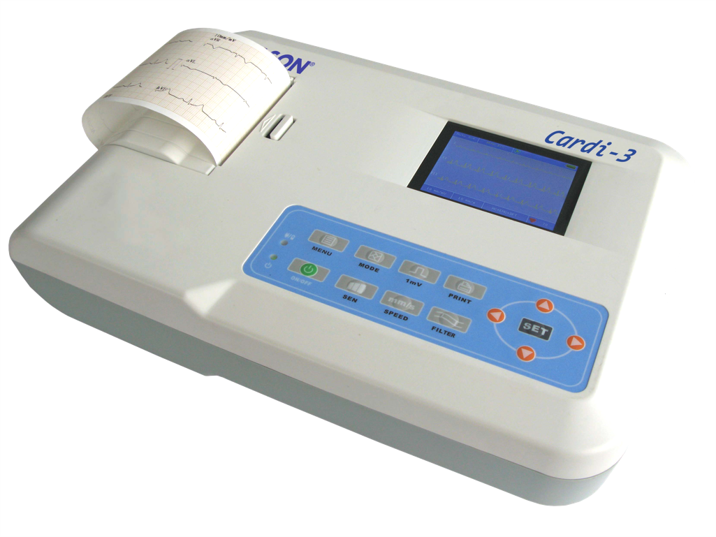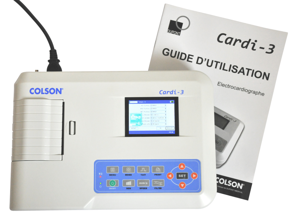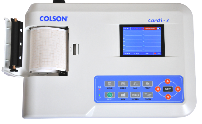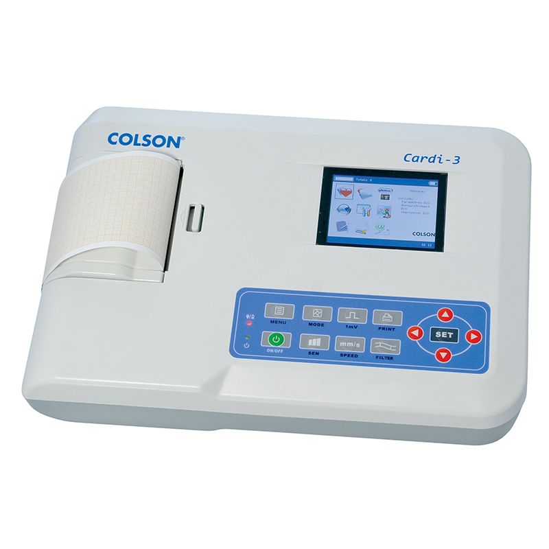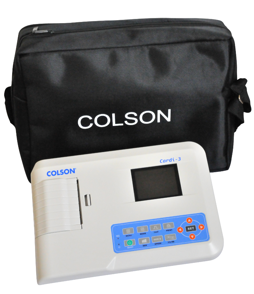 El modelo Cardi-3 de Colson permite hacer varias pruebas a la vez, en el, podemos grabar de forma manual y automática con cálculo de diferentes parámetros y también imprimirlos en diferentes formatos: 2,3 y 4 derivaciones estándar; y 1, 2, 3, y 4, derivaciones de vigilancia del ritmo, también se puede visualizar en su pantalla a color LCD 3, 6 o 12 derivaciones así cómo identificar y grabar las ECG.