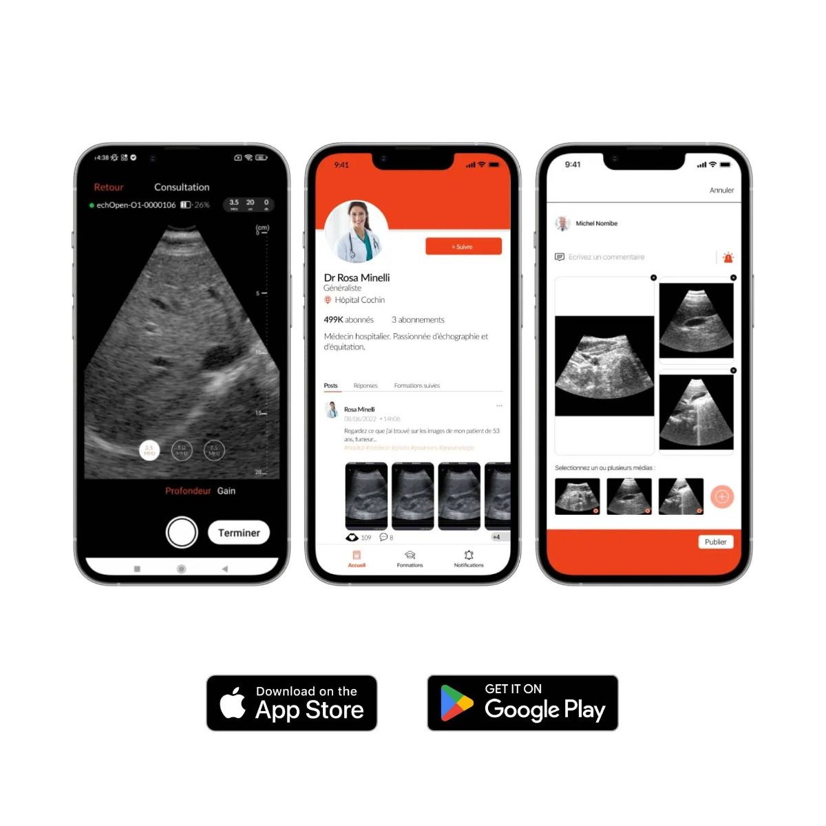 Gracias a su interfaz intuitiva y asistida, elecógrafo ultraportátil EchOpen 01 permite realizar ecografías específicas en menos de cinco minutos. Su aplicación dedicada ofrece contenidos educativos y colaborativos, perfectos para mejorar sus habilidades e intercambiar ideas con otros profesionales sanitarios.