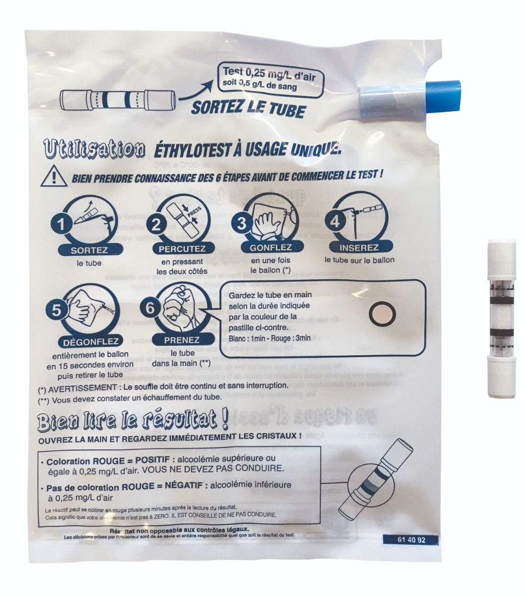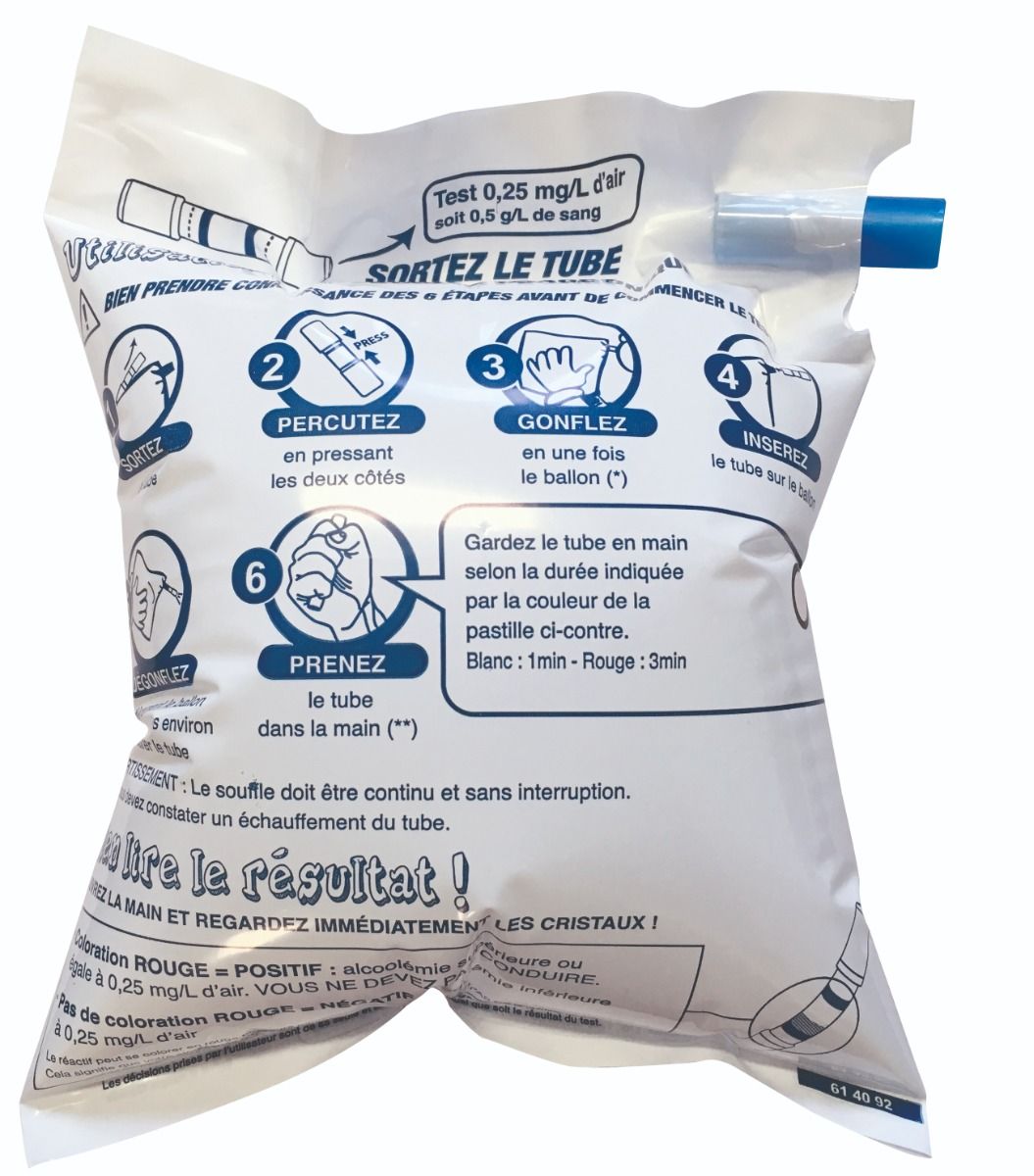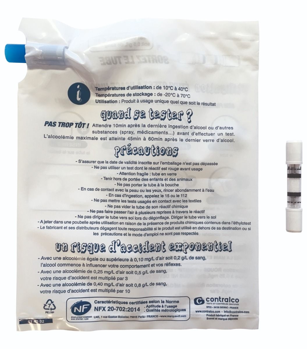 Test de alcoholemia constituido de un tubo reactivo y de una bolsita plástico conteniendo el volumen exacto de aire necesario. Test homólogo por el ministerio de la salud.