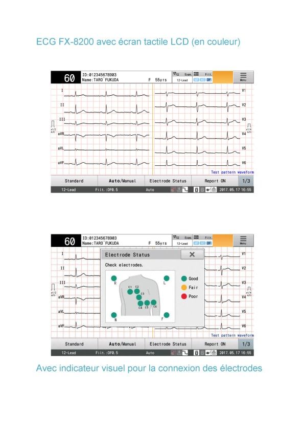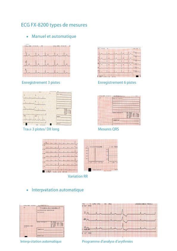 El equipo de la ECU Fukuda Denshi de 6 pistas FX-8200 es tan simple y preciso como el anterior, pero es más ergonómico y más práctico. Su gran pantalla táctil LCD en color de 7 pulgadas con pantalla brillante con código de color le brindará una comodidad de lectura inigualable durante sus exámenes de monitoreo cardíaco. Su tamaño también ofrece la posibilidad de visualizar simultáneamente las doce derivaciones.