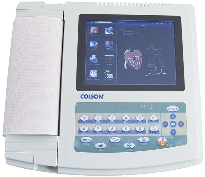 El sistema de ECG Cardi-12 Colson es una herramienta médica de alta calidad diseñada para el registro preciso de la actividad eléctrica del corazón. Permite visualizar simultáneamente 12 canales electrocardiográficos para un diagnóstico preciso y eficiente.
