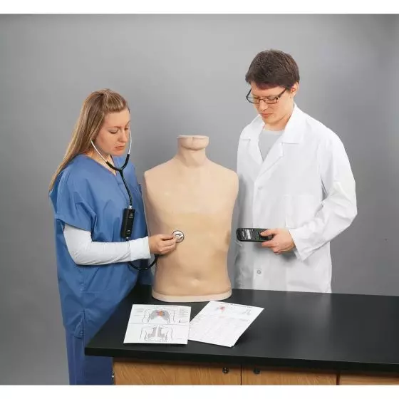 Los ruidos pulmonares pueden ser detectados en cinco lugares anteriores, 10 posteriores y dos a los costados del maniquí (sobre la línea axilar). En cuanto a los sonidos cardíacos, estos se pueden encontrar en 6 lugares del cuerpo distintos. Gracias al control electrónico, es posible cambiar los escenarios con el fin de incrementar la complejidad o variar el examen con el objetivo de entrenarse en diferentes diagnosticos posibles. Además, no es necesario dirigir el control hacia el maniquí o el SmartScope para que este funcione. Con el control se manejará el SmartScope en un radio de 30 metros, lo cual será bastante útil cuando realice trabajos en grupo. Usted puede escuchar los sonidos utilizando los auriculares conectados en el SmartScope o conectando el amplificador que viene incluido con el modelo, lo cual es igualmente útil cuando se está trabajando con múltiples personas.