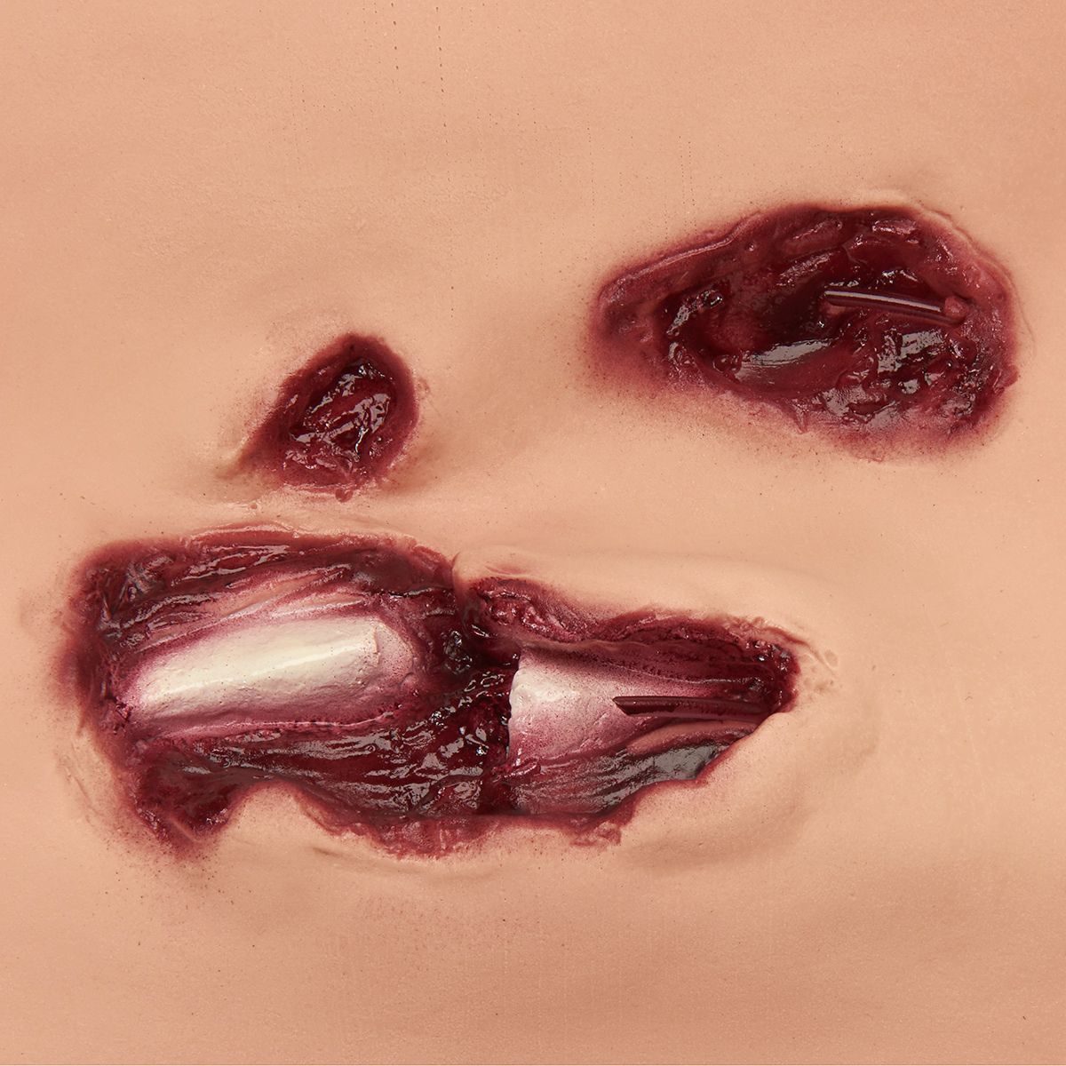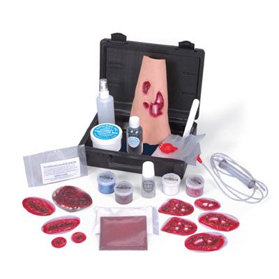 La forma más económica para empezar con las lesiones simuladas. Las heridas reutilizables y los accesorios rellenables permiten practicar técnicas de vendaje y entablillado repetidamente. El equipo de simulación se entrega en una caja e incluye: