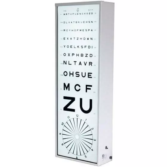 Escala luminosa de agudeza visual de Monoye Ella Legros lectura a distancia de 3m - Optotipo en acrílico con cristal de seguridad - Caja de chapa blanca - Luz global con interruptor - Dimensiones de la caja: 270 x 120 x 777 mm - Peso: 8 kg - Dos tubos