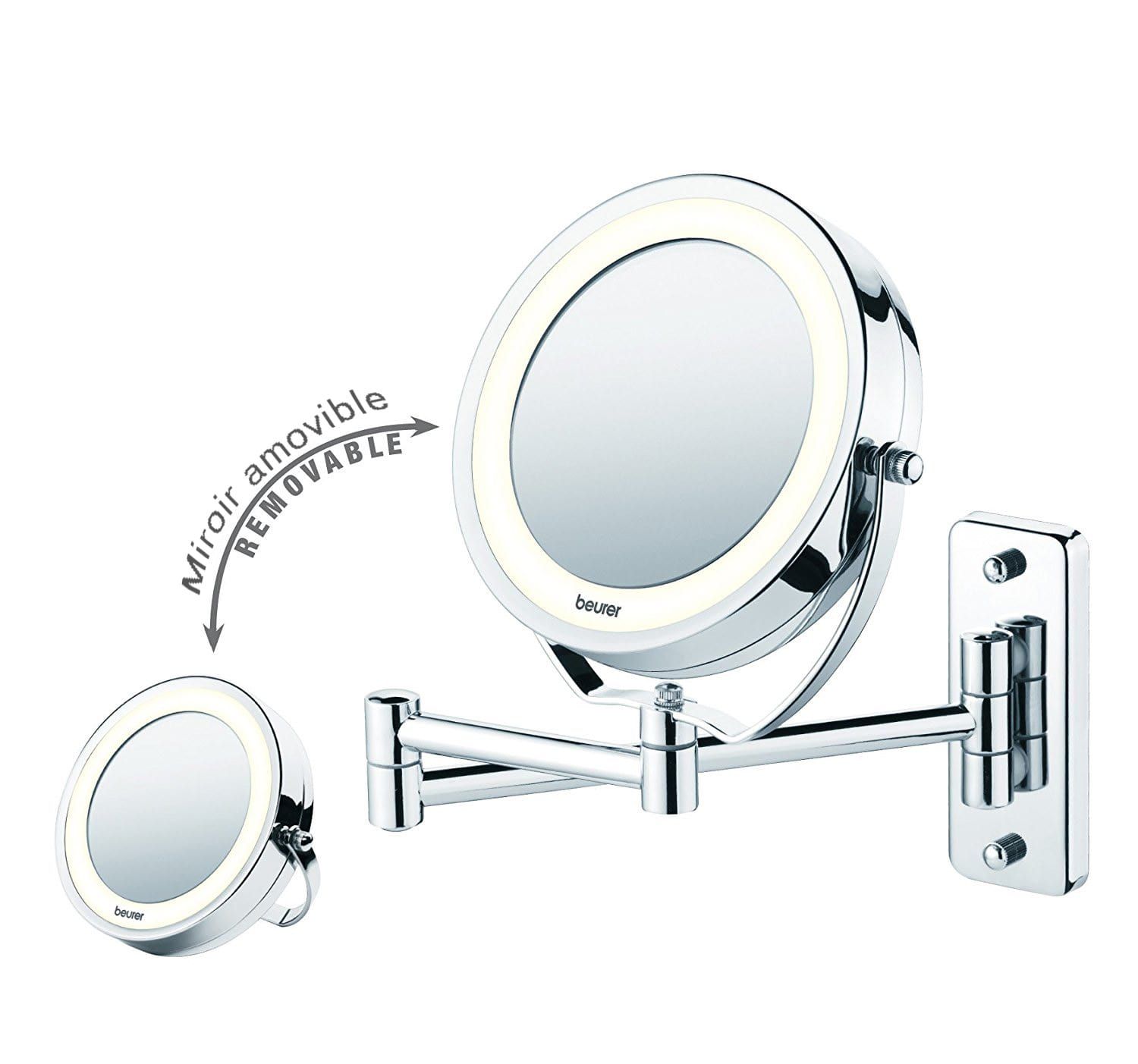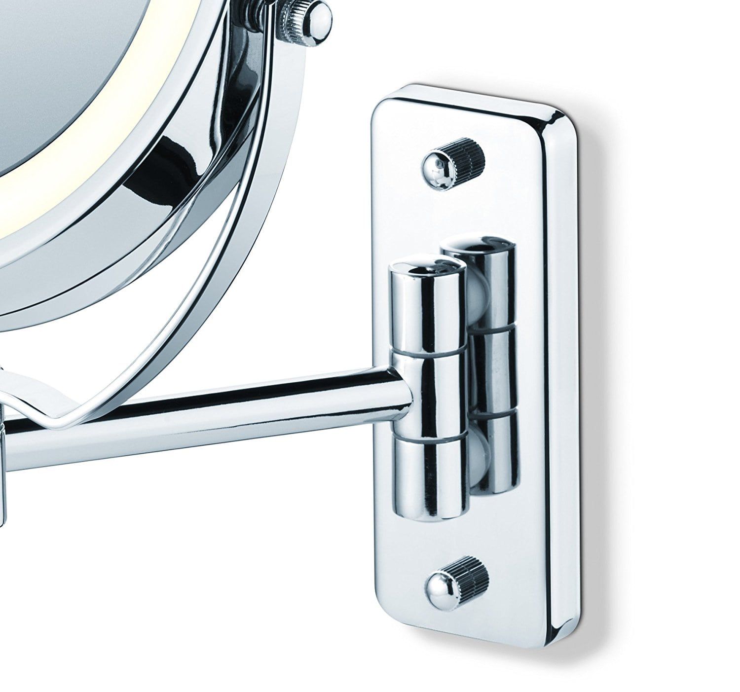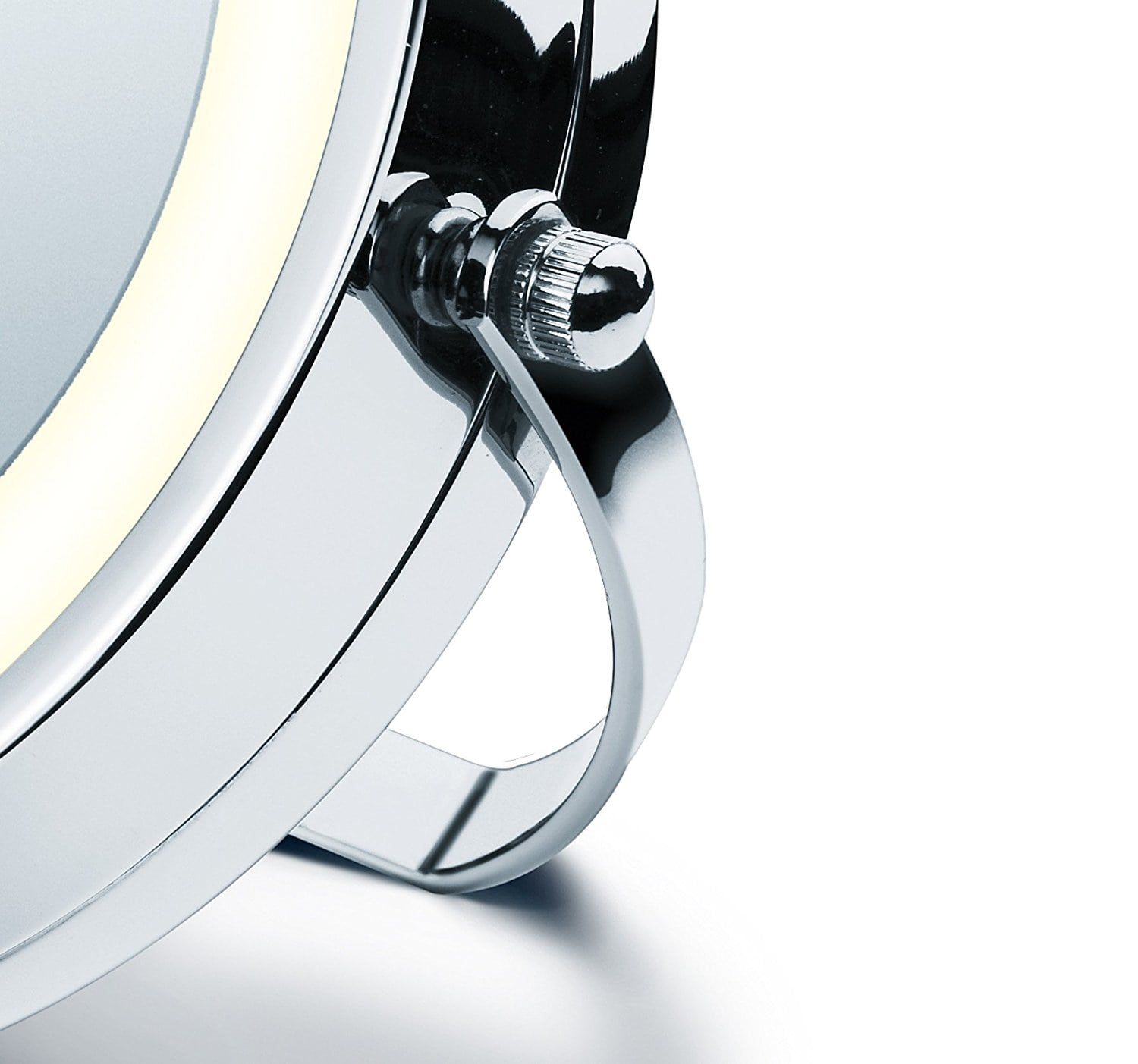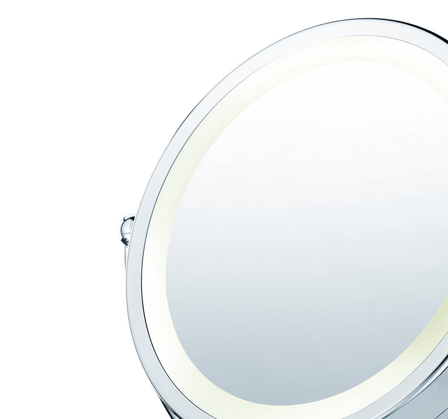 El Espejo con luz Beurer BS 59 es un espejo 2 en 1 de color plateado cromado que se fija a la pared o sobre su soporte de pie.