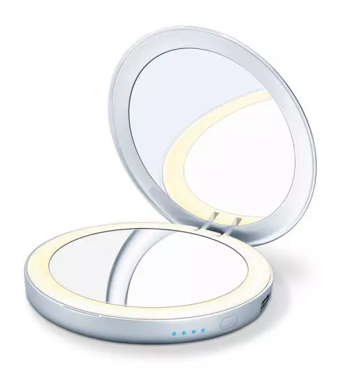 El espejo de aumento con luz BS 39 posee dos superficies reflectivas. La primera es una superficie normal y la segunda una superficie con aumento de 3 veces. El espejo es práctico para que usted lo lleve a donde lo desee ya que es un espejo pequeño y ligero. Por otro lado, el espejo Beurer le permite cargar sus dispositivos móviles gracias a la batería integrada de 3 000 mAh que posee. Una vez usted haya abierto el espejo, una luz LED se encenderá automáticamente para ofrecerle la mejor vista a través del espejo. Su luz LED le permitirá realizar sus retoques de maquillaje sin importar donde usted se encuentre. El espejo con luz LED Beurer BS 39 es un objeto verdaderamente útil de uso cotidiano ya que es un objeto 2 en 1 (espejo y batería portátil). Asimismo, el espejo es fácil de cargar ya que lo puede colocar en su bolsa y llevarlo consigo. Debe tener en cuenta que la carga de la batería integrada toma un tiempo de alrededor 4 horas para lograr una carga completa.