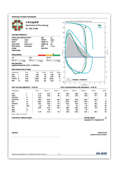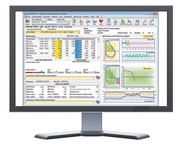Spirolab 7" incorpora funciones avanzadas como la comparación de broncodilatadores PRE/POST, lo que permite evaluar los cambios en los parámetros respiratorios mediante protocolos adecuados. También ofrece una interpretación automática de los resultados basada en más de 30 parámetros, así como un control de calidad de las pruebas para que los análisis sean más seguros.