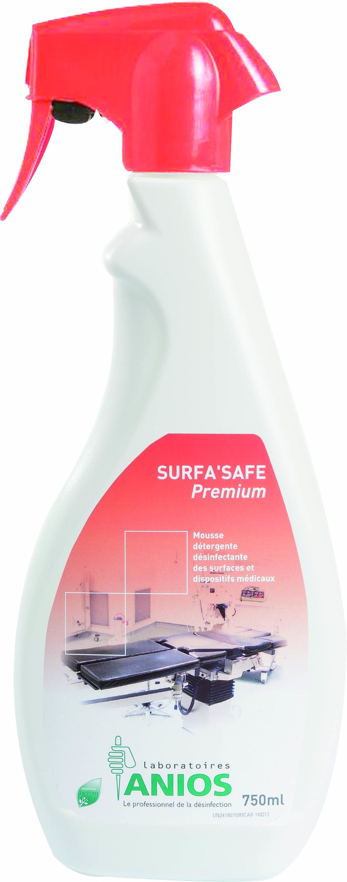ANIOS SURFA'SAFE es un detergente limpiador y desinfectante rápido de dispositivos médicos y superficies, en espuma, sin alcohol ni olor, con rociador.