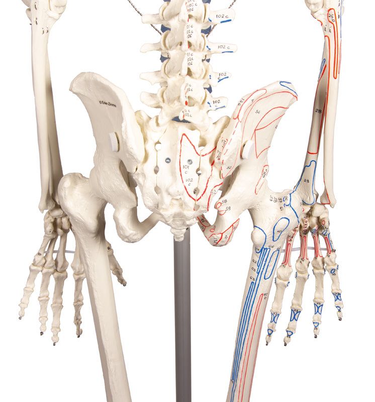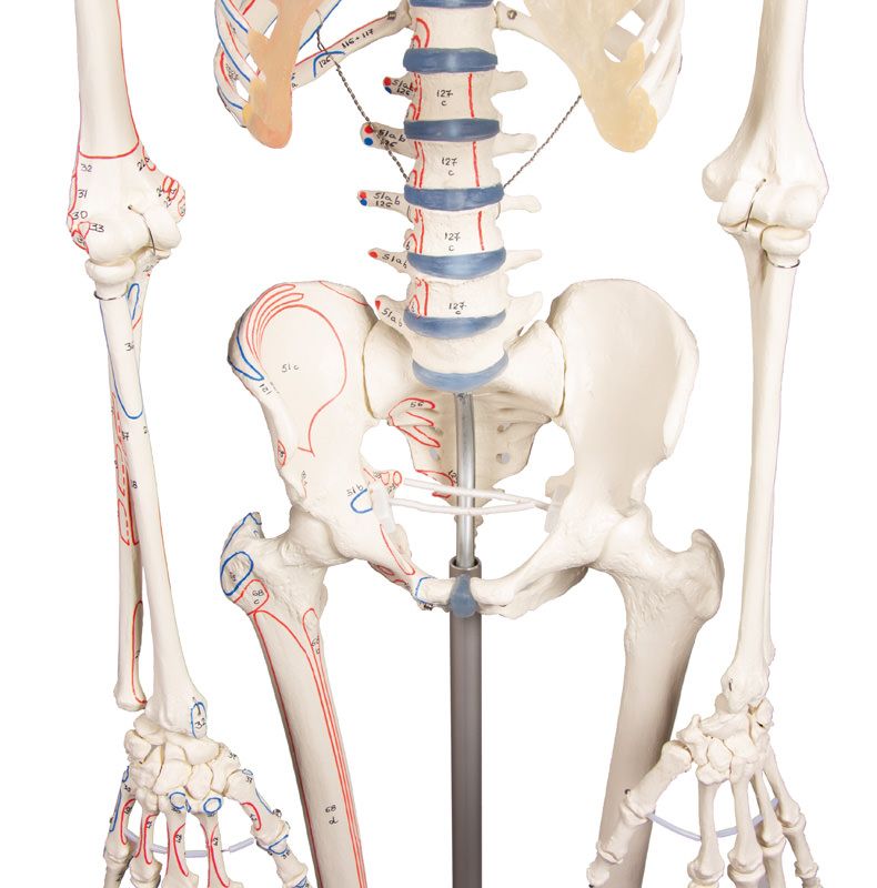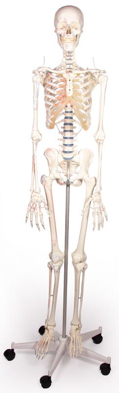 Los hombros, las caderas, las rodillas y los tobillos están sujetos por juntas flexibles que se comportan como los ligamentos, lo que hace que cada movimiento sea muy realista. Los brazos y las piernas del esqueleto ""Arnold"" con músculos 3008 Erler Zimmer pueden desmontarse y, a su vez, las piernas pueden dividirse en 3 partes retirando las fijaciones de las rodillas y los tobillos. Los omóplatos pueden retirarse fácilmente y el cráneo puede separarse en 3 piezas (la parte superior, la base del cráneo, y la mandíbula inferior).