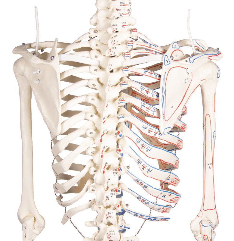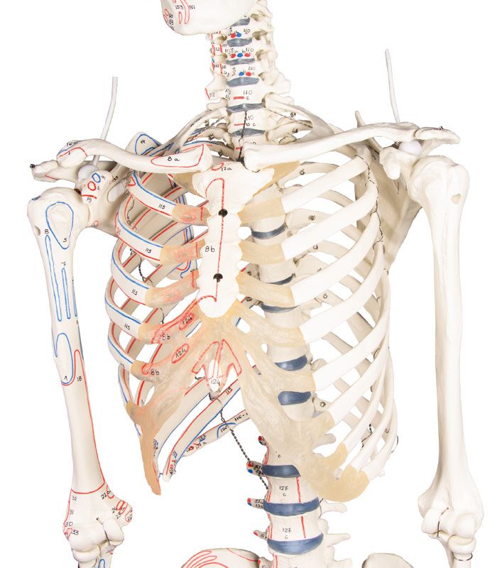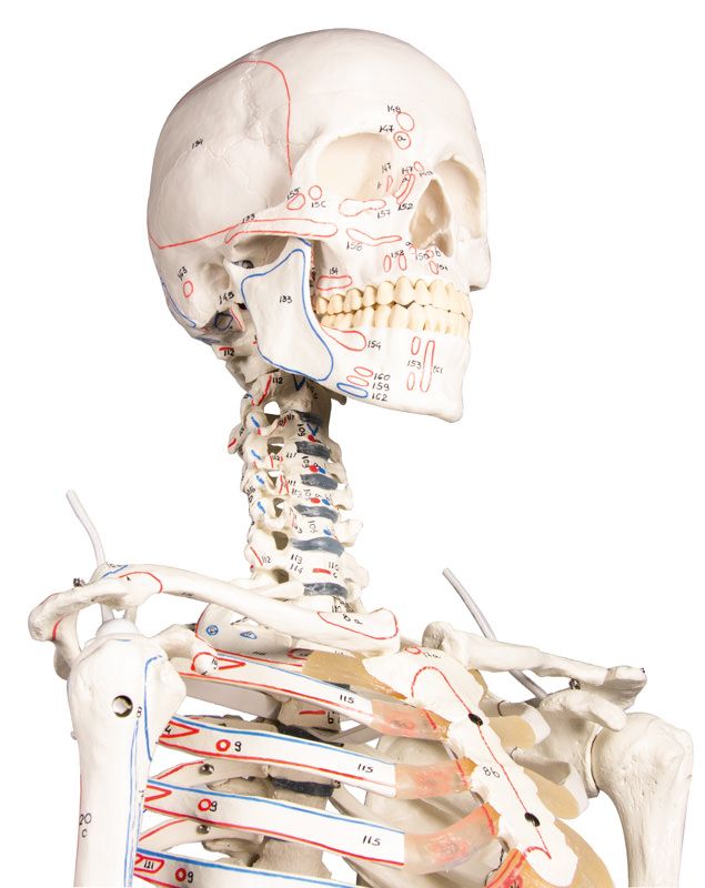 Este modelo cuenta con marcas en los huesos, exactamente en los lugares por los que pasan los músculos. Estas marcas en color y numeradas están presentes en el lado derecho, además, se incluye una nota explicativa para entender cada una de las marcas.