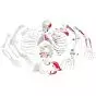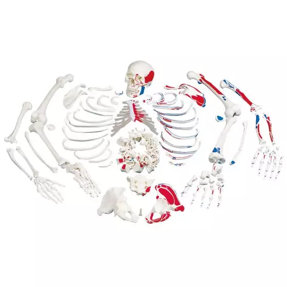 Esqueleto con descripción de músculos, desarticulado A05/2 - Versión especial está pintada a mano y enumerada con el fin de mostrar los orígenes de los músculos en rojo y las inserciones musculares en azu
