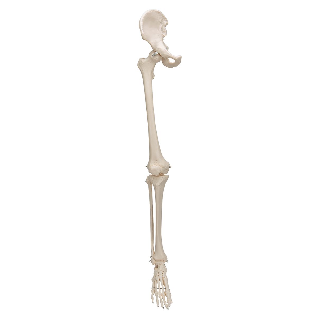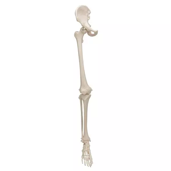 Este esqueleto de pierna es un instrumento necesario para estudiar la anatomía detallada de la pierna humana. El modelo está mantenido con cables para ser más realístico. Las articulaciones están flexibles. La articulación de la pierna lo está también.