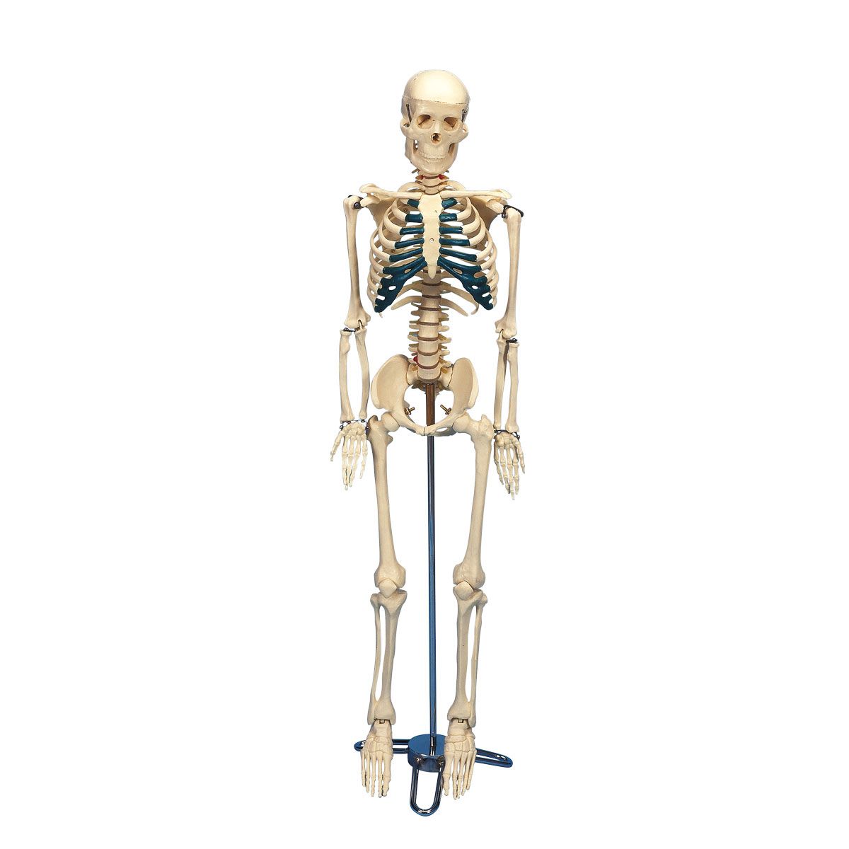 Gracias a su práctico tamaño, este esqueleto sencillo y de precio comodo sirve para aprender y también para decorar. Además del aparato locomotor óseo, están representados los nervios espinales, las arterias vertebrales y un prolapso de disco intervertebral. Brazos y piernas son movibles. Suministro con soporte. Tamaño: 84 cm