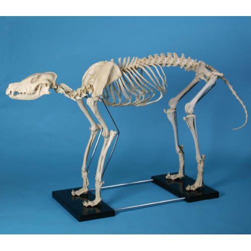 Modelo del esqueleto de un perro de pequeño tamaño. El cráneo y cola desmontable, además la mandíbula está movil. El modelo se pone sobre un zócalo en plástico que no se destaca. Diferente postura posible