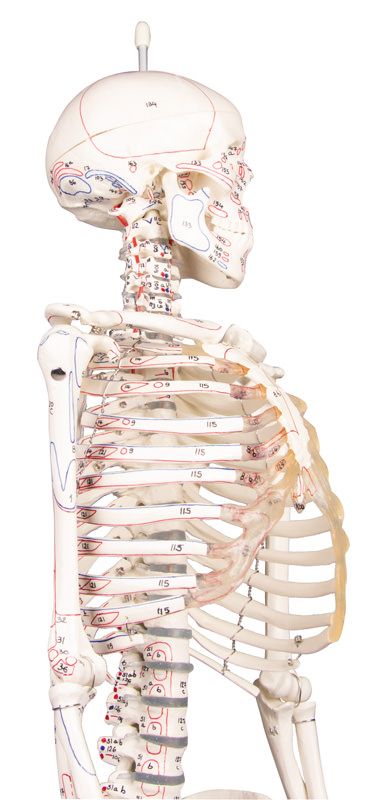 El emplazamiento de los músculos están representados en color y numerados. Para ayudar a su comprensión, una descripción de cada músculo se envía en un cuaderno junto al Esqueleto en miniatura ""Daniel"" con músculos numerados 3035 Erler Zimmer.
