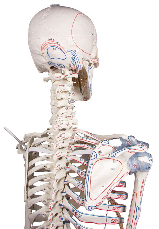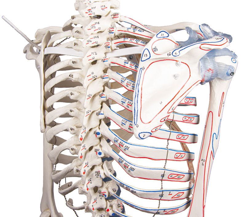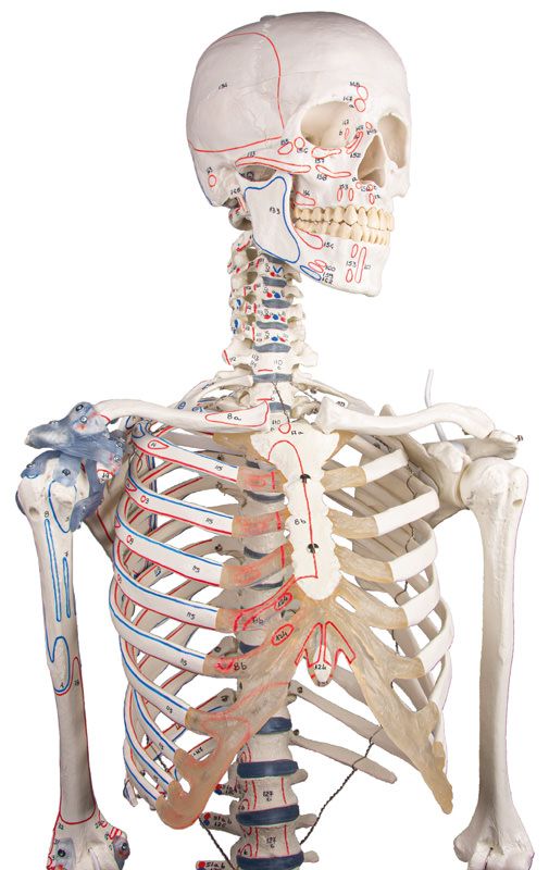 Este modelo es una representación a tamaño real del esqueleto humano. Se caracteriza por una representación de todos los detalles anatómicos, grietas, agujeros y procesos anatómicos. El cráneo puede desmontarse en tres partes. Además, cuenta con los siguientes elementos: