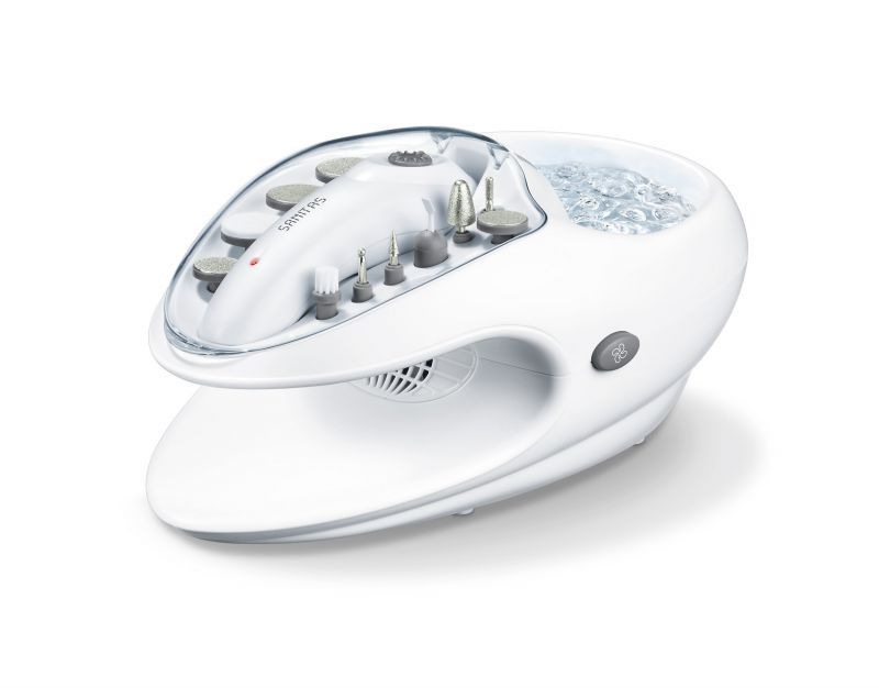 La estación de manicura y pedicura Sanitas SMA 45 es un equipamiento completo para el cuidado de las manos y los pies. Dispone de 11 cabezales de calidad premium para eliminar las pieles muerta, limar las uñas, quitar los callos, retirar las uñas encarnadas, empujar las cutículas, etc... La estación dispone además de un recipiente para introducir agua y realizar así un baño de burbujas para las manos.