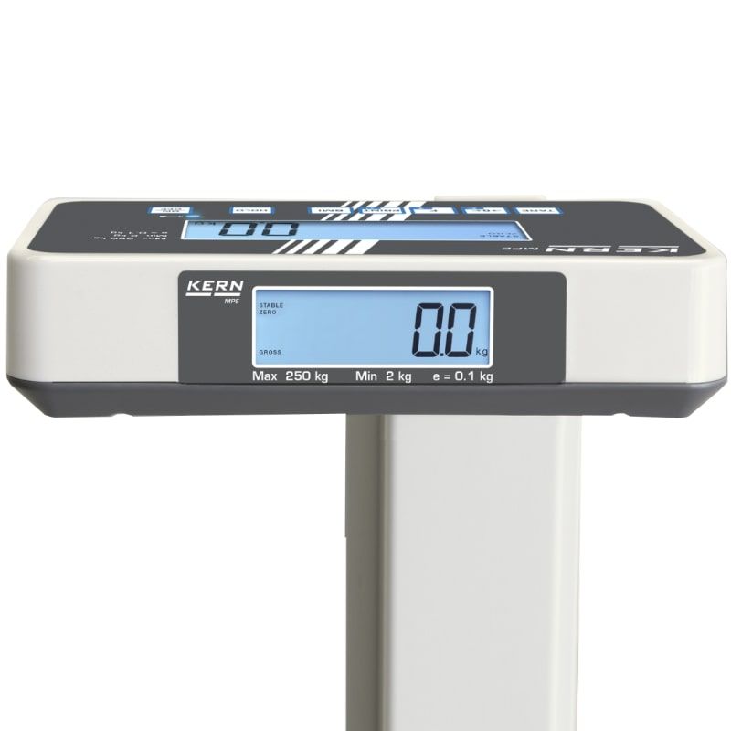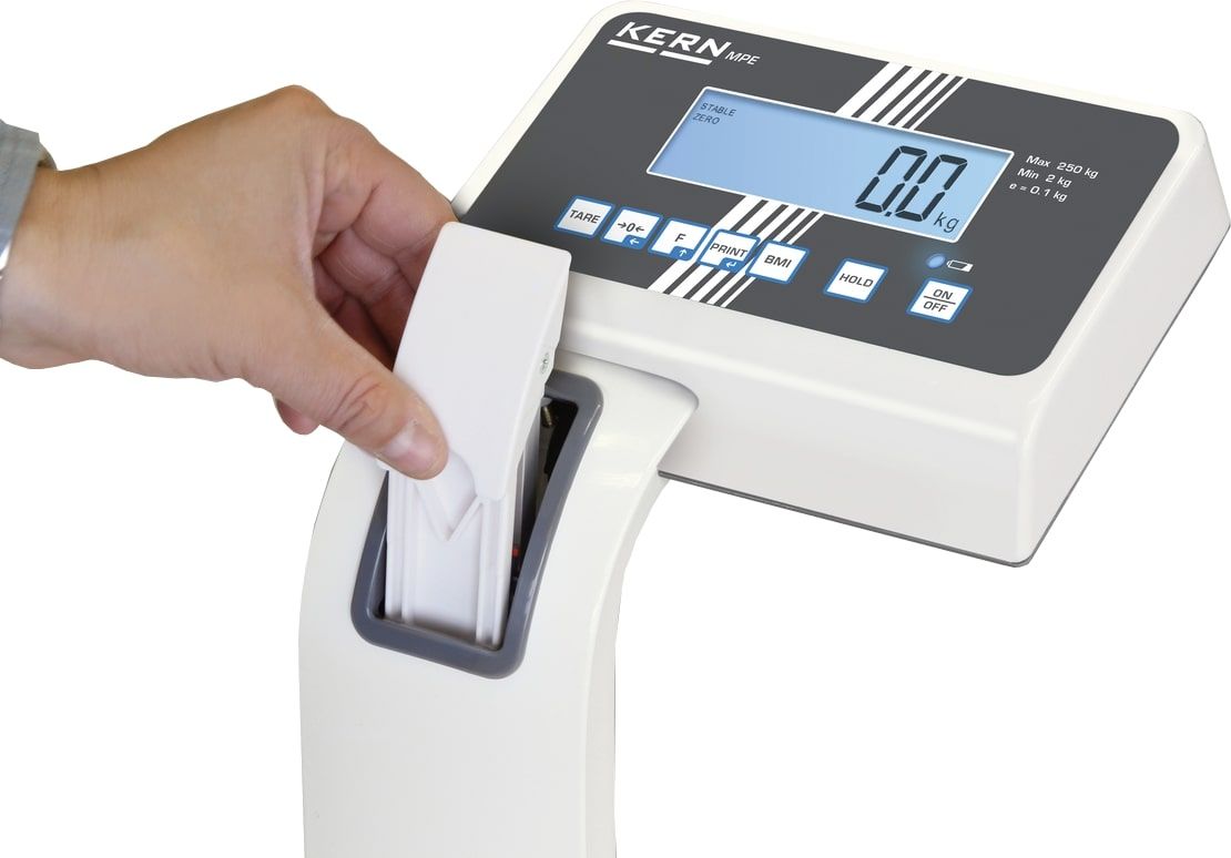 Esta báscula electrónica MPE de Kern con indicador de altura es especialmente avanzada. La función Hold permite pesar a pacientes agitados, la función madre-hijo facilita el pesaje preciso de bebés y la función IMC permite determinar si un paciente tiene un peso inferior o superior al normal.