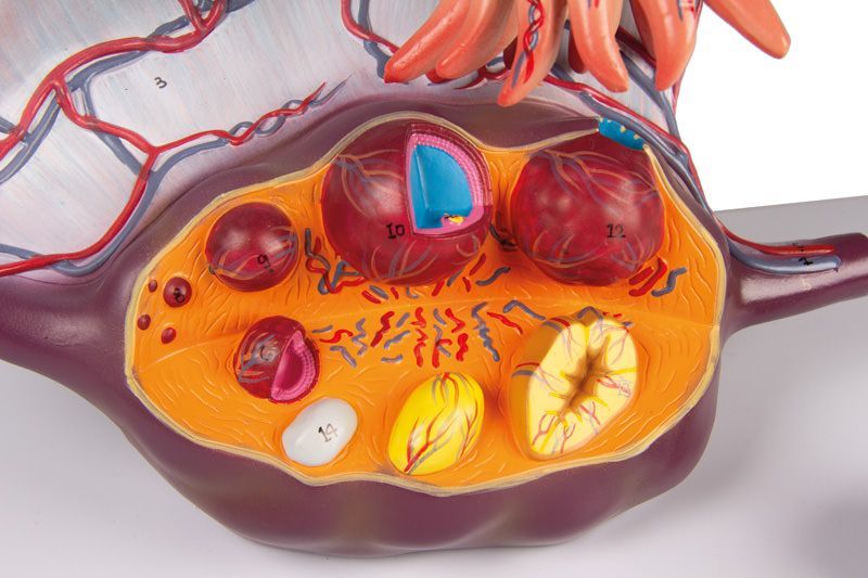 Este modelo anatómico de estructura ovárica meticulosamente diseñado pone de relieve las diferentes etapas del desarrollo folicular, desde la formación del folículo primario hasta la etapa del cuerpo albicans. Observa de cerca la evolución de los folículos y comprende su papel crucial en la producción de óvulos.