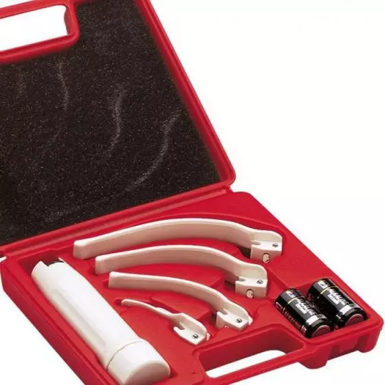 Estuche Laringoscopio Policarbonato a F.O Comed - 3 láminas Mac Intosh y 1 lámina Miller 0 -láminas uso único (U.U) - Incluido con 2 pilas R14 - 1 bombilla de cambio